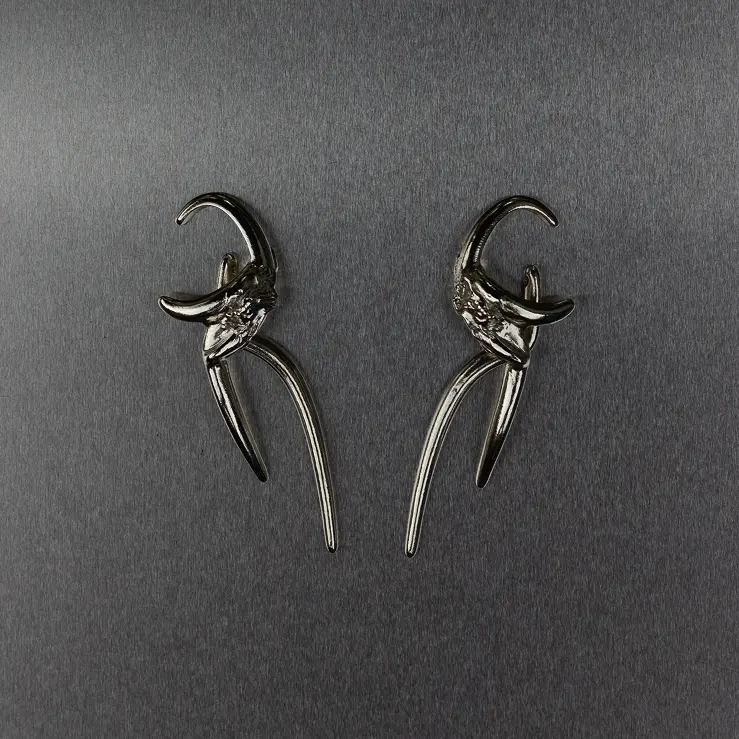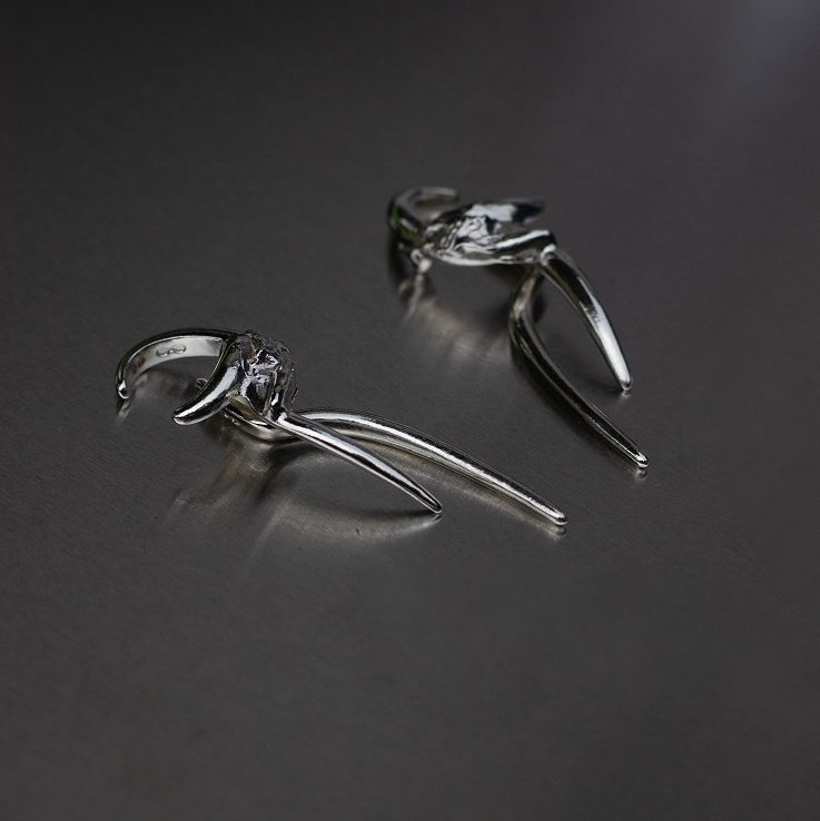 AÏRHEN measures approximately 2 cm × 6 cm × 1.75 cm. This modular two-piece earring follows the line behind the ear and along the neck, forming a soft curve that feels as if it is still growing. Its shape reflects the natural contours of the face and guides the eye along its descent. AÏRHEN can be worn on its own for a subtle sculptural effect or combined with the longer back piece to extend its silhouette. With the extension, the earring shifts from a delicate trace to a more pronounced sculptural presence. It carries both strength and fluidity, drawing the gaze without insisting on it. Each AÏRHEN is digitally crafted in Berlin and produced in Belgium. All pieces are made to order and may require up to three weeks. Every item is unique, with slight natural variations that reflect its creation and give the piece its own quiet character.